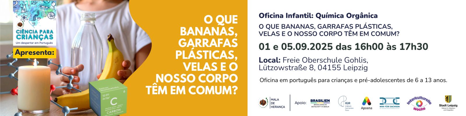 Nesta palestra interativa, crianças (de 6 a 13 anos) vão descobrir de forma lúdica por que esse elemento especial está presente em todos os aspectos do nosso dia a dia. Vamos aprender o que são átomos, como eles se ligam e por que o carbono é a base de toda a vida.