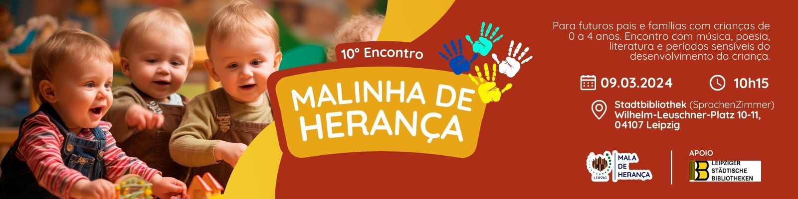 O próximo encontro da Malinha de Herança em Leipzig está se aproximando! Em meio à música, brincadeiras, leitura e poesia, continuaremos falando sobre os desafios da maternidade e paternidade no exterior, períodos sensíveis do desenvolvimento das crianças, gestação e parto, cuidados com os bebês, educação plurilíngue e outros assuntos pertinentes à gestação e aos primeiros 4 anos da criança. Venham conosco nessa jornada de troca e aprendizado!